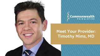 Dr. Timothy Mims, M.D, is a highly-trained physician at Commonwealth Pain & Spine, known for his expertise and dedication to providing exceptional patient care. He has been with the practice since 2023. With a strong foundation in microbiology and immunology, Dr. Mims earned his Bachelor of Science from the University of Miami before pursuing his Doctor of Medicine at Ross University School of Medicine.